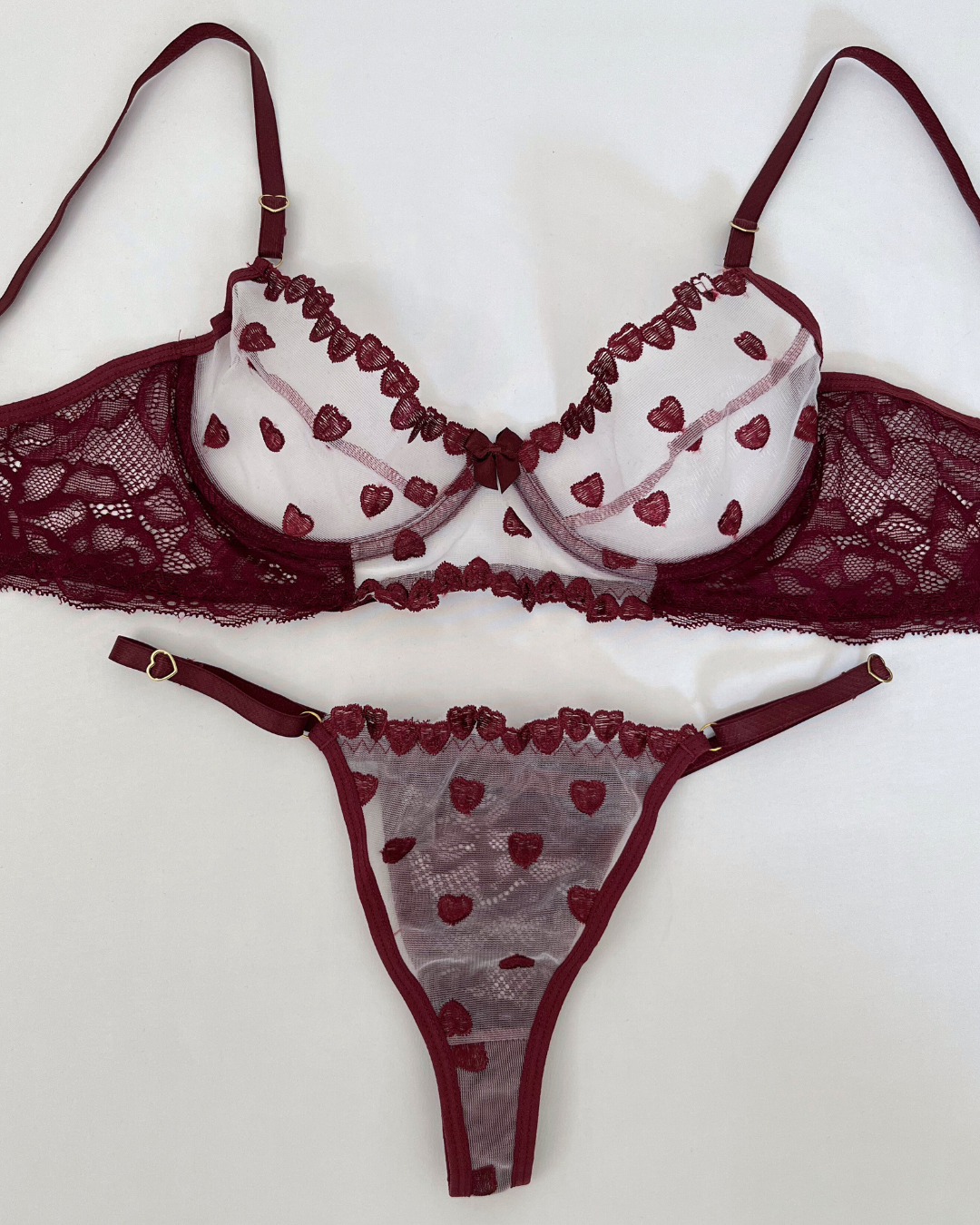 This bra and panty set is romantic and very sensual. Made entirely of tulle embroidered with hearts and finished in lace, it offers sensuality through transparency.